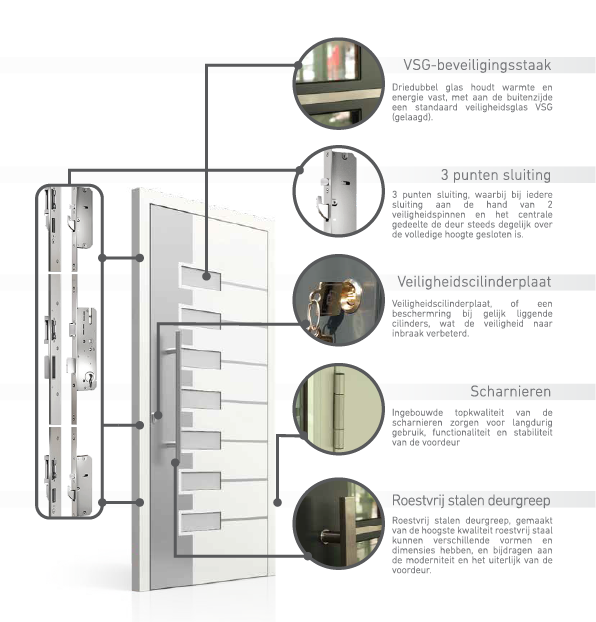 Deuren spelen een cruciale rol in het bepalen van de esthetische uitstraling van uw woning en benadrukken het unieke karakter ervan. Ongeacht uw wensen is het mogelijk om deuren te ontwerpen die perfect aansluiten bij uw behoeften. Er zijn deuren beschikbaar met een hoog veiligheidsniveau, evenals deuren met extra geluidsisolatie, voorzien van aangepast beslag en de mogelijkheid om te combineren met aluminium dorpels. Naast veiligheids- en decoratief glas zijn er verschillende deurvullingen beschikbaar die in dezelfde kleur als de profielen uitgevoerd kunnen worden.